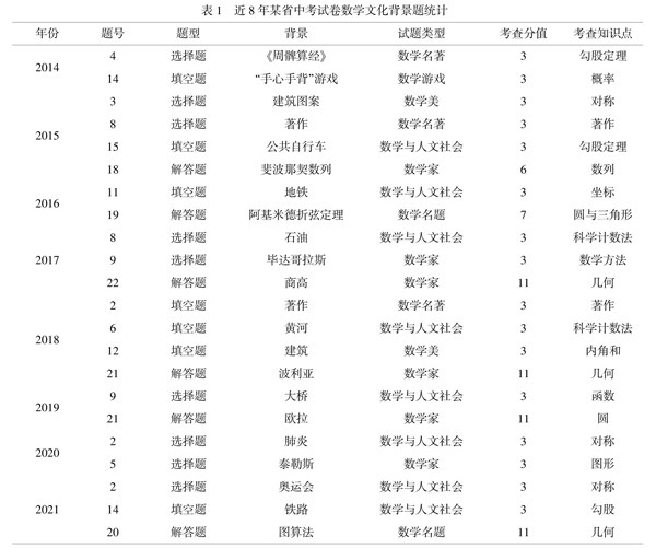 摘 要:有关数学文化的课题是教育界的研究热点,数学文化背景题已成为各阶段考试的重要考点。本文在分析某省2014-2021年中考数学试卷的基础上,总结数学文化在中考试卷中的分布特点和试卷中融合数学文化的主要途径,为初中数学课程中数学文化相关内容的教与学提供参考。