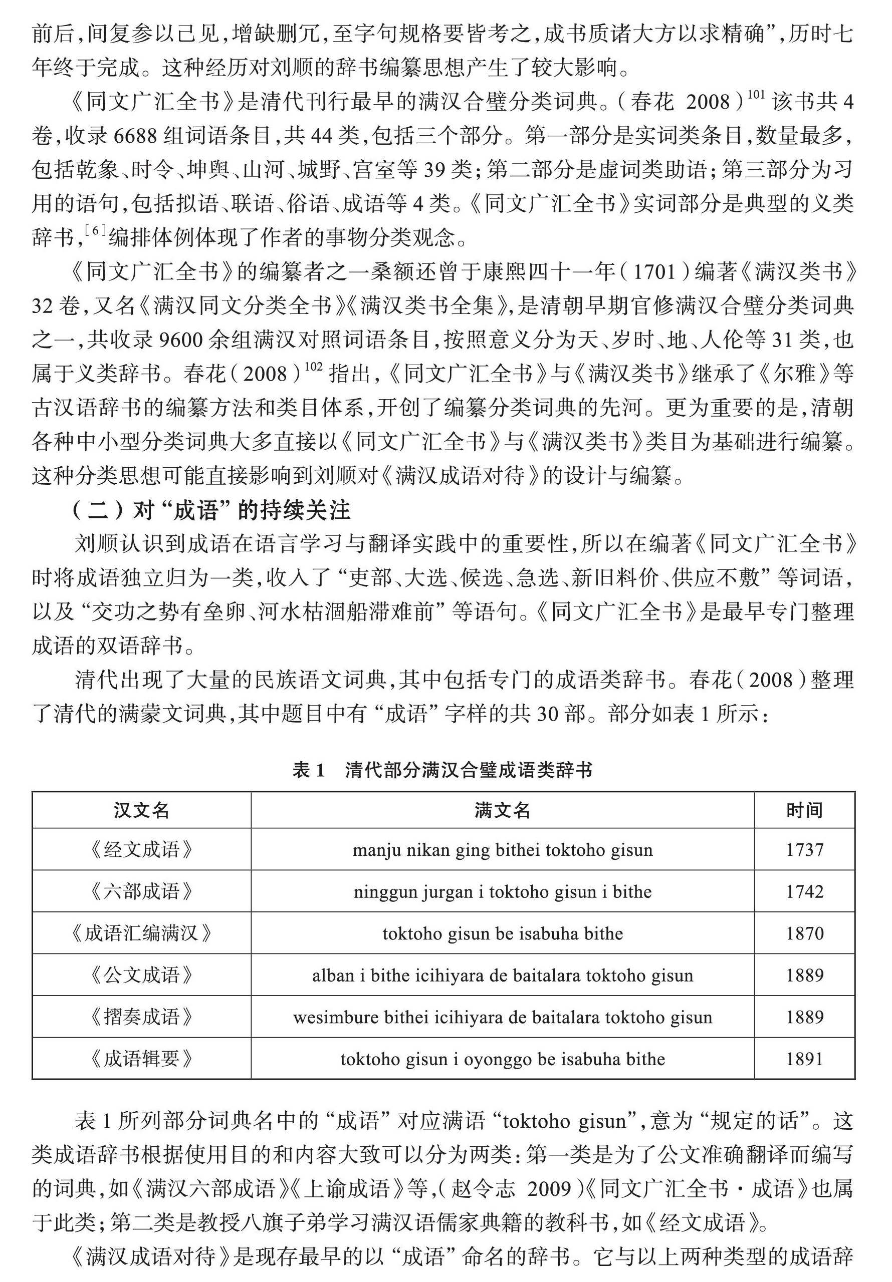 摘 要 《满汉成语对待》成语部分是一部按照义类辞书体例进行编排的清初东北方言辞书。全书共487个词条,分为十类。每个词条均由“主题词+注释说明”两部分构成。主题词有“××,××的,(不)叫/教××的,说××的”四类形式。注释说明具有类属名词罗列、叙述评价交错、主题词造句等特点。主题词与注释说明的关系包括主体—描写、概括—举例及话题—相关等三类。(剩余17667字)
