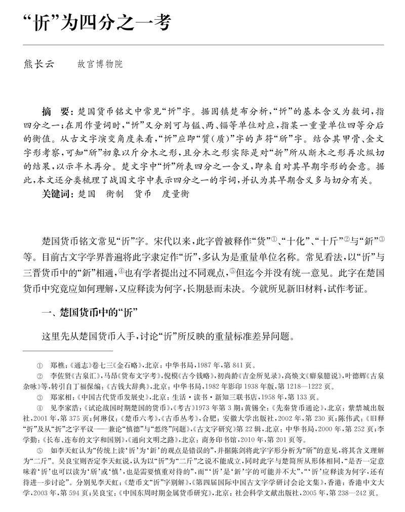 摘 要: 楚国货币铭文中常见“GF8A3”字。据固镇楚布分析,“GF8A3”的基本含义为数词,指四分之一;在用作量词时,“GF8A3”又分别可与镒、两、锱等单位对应,指某一重量单位四等分后的衡值。从古文字演变角度来看,“GF8A3”应即“質(质)”字的声符“斦”字。结合其甲骨、金文字形考察,可知“斦”初象以斤分木之形,且分木之形实际是对“折”所从断木之形再次纵切的结果,以示半木再分。(剩余15843字)