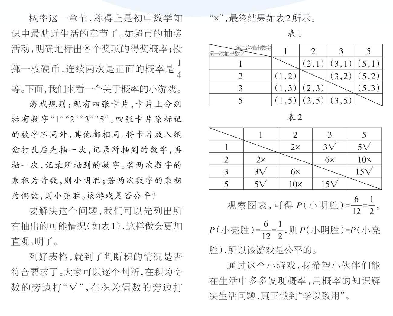 游戏规则:现有四张卡片,卡片上分别标有数字“1”“2”“3”“5”。四张卡片除标记的数字不同外,其他都相同。将卡片放入纸盒打乱后先抽一次,记录所抽到的数字,再抽一次,记录所抽到的数字。(剩余479字)