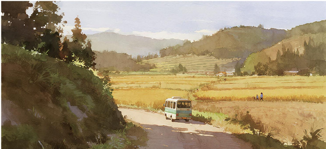 班车晃过乡间小路,旧车胎在尘土路上留痕。窗外,放眼望去是稻田里金黄的稻穗、田垄间辛勤耕作的农民。