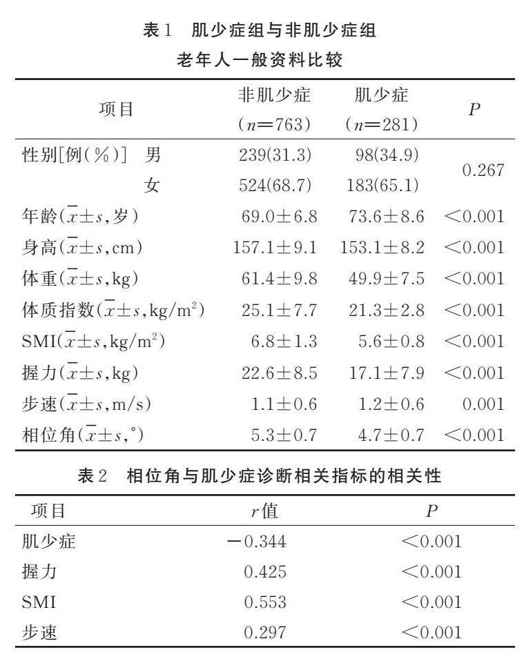 Abstract Objective:To explore application value of phase angle on screening for sarcopenia of elderly in community,and to clarify its cutoff value for screening sarcopenia.Methods:1 044 elderly living in communities in Hunan province were selected as subjects by stratified cluster random sampling from June to September 2019.The muscle mass and phase angle were measured by bioelectrical impedance analysis,the grip strength was measured by grip strength meter,the height was measured by infrared height meter,the weight was measured by electronic mass scale,and the pace was calculated according to elderly's 6 m walking time.Correlation between phase angle and sarcopenia and its diagnostic indicators was analyzed by Spearman correlation.Cutoff value of phase angle for screening sarcopenia was got by receiver operating characteristic curve.Results:The prevalence of sarcopenia among elderly living in communities in Hunan province was 26.9%,with 98 males and 183 females.Spearman correlation analysis showed that phase angle was correlated with sarcopenia,grip strength,skeletal muscle mass index,and pace.The receiver operating characteristic curve showed that when the phase angle of male was 5.15 °,the Youden index was 0.356,the sensitivity was 0.582,the specificity was 0.774,and the area under curve was 0.748(0.691,0.804).When the phase angle of female was 4.75°,the Youden index was 0.351,the sensitivity was 0.612,the specificity was 0.739,and the area under curve was 0.736(0.694,0.777).The differences were statistically significant(P<0.05).Conclusions:Phase angle is correlated with sarcopenia and its diagnostic indicators,and can be used as screening indicator for sarcopenia.However,its cutoff value still needs further exploration.