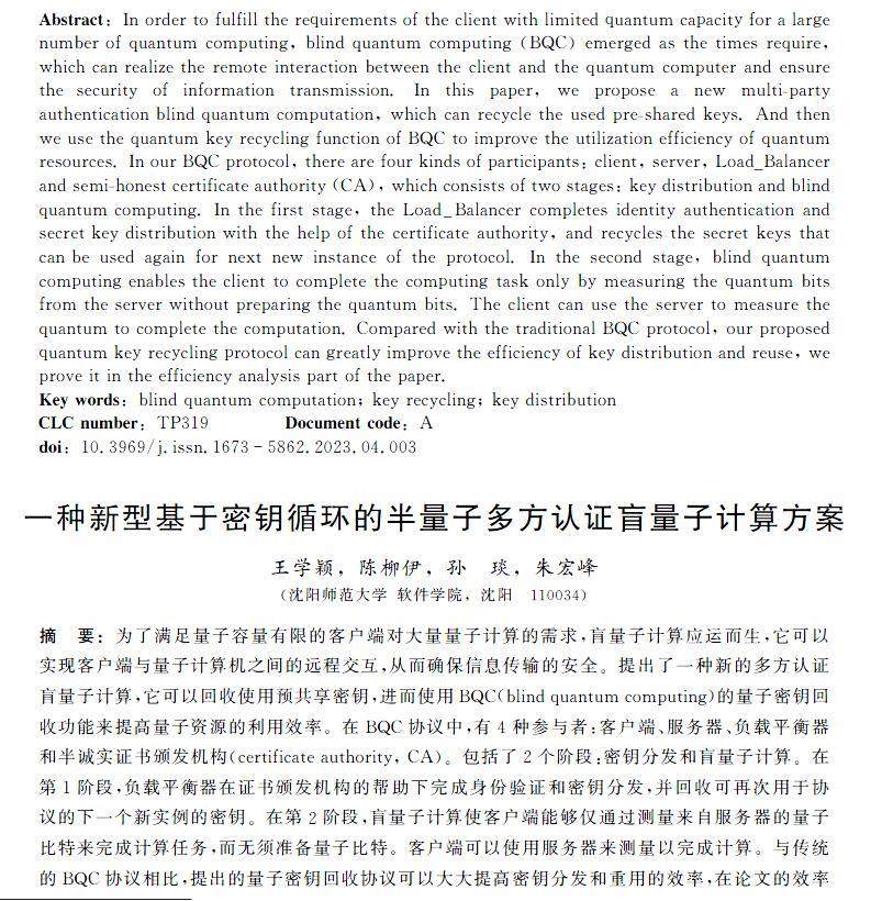 摘要:为了满足量子容量有限的客户端对大量量子计算的需求,盲量子计算应运而生,它可以实现客户端与量子计算机之间的远程交互,从而确保信息传输的安全。(剩余34623字)
