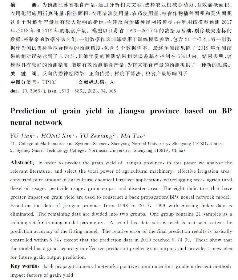 摘要:为预测江苏省粮食产量,通过分析相关文献,选择农业机械总动力、有效灌溉面积、农用化肥施用折算纯量、除涝面积、农用柴油使用量、农药使用量、粮食作物播种面积和受灾面积这8个对粮食产量具有较大影响的指标,构建反向传播神经网络模型,并利用该模型预测2017年、2018年和2019年的粮食产量。模型以江苏省1993—2019年的数据为基础,剔除缺失指标的数据,将剩余的数据分为2组,一组数据作为训练集用于训练模型参数,包含21个样本;另一组数据作为测试集检验拟合模型的预测精度,包含5个数据样本。(剩余6597字)
