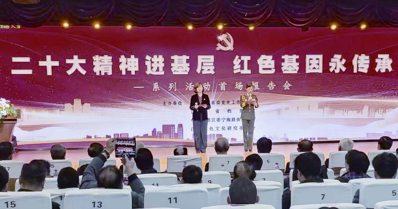 3月19日下午,由中共江苏省委党史工作办公室、江苏省档案馆、中共鼓楼区委宁海路街道工委、江苏红色文化研究委员会共同主办的“二十大精神进基层,红色基因永传承”系列活动首场报告会,在南京市宁海中学礼堂举行。