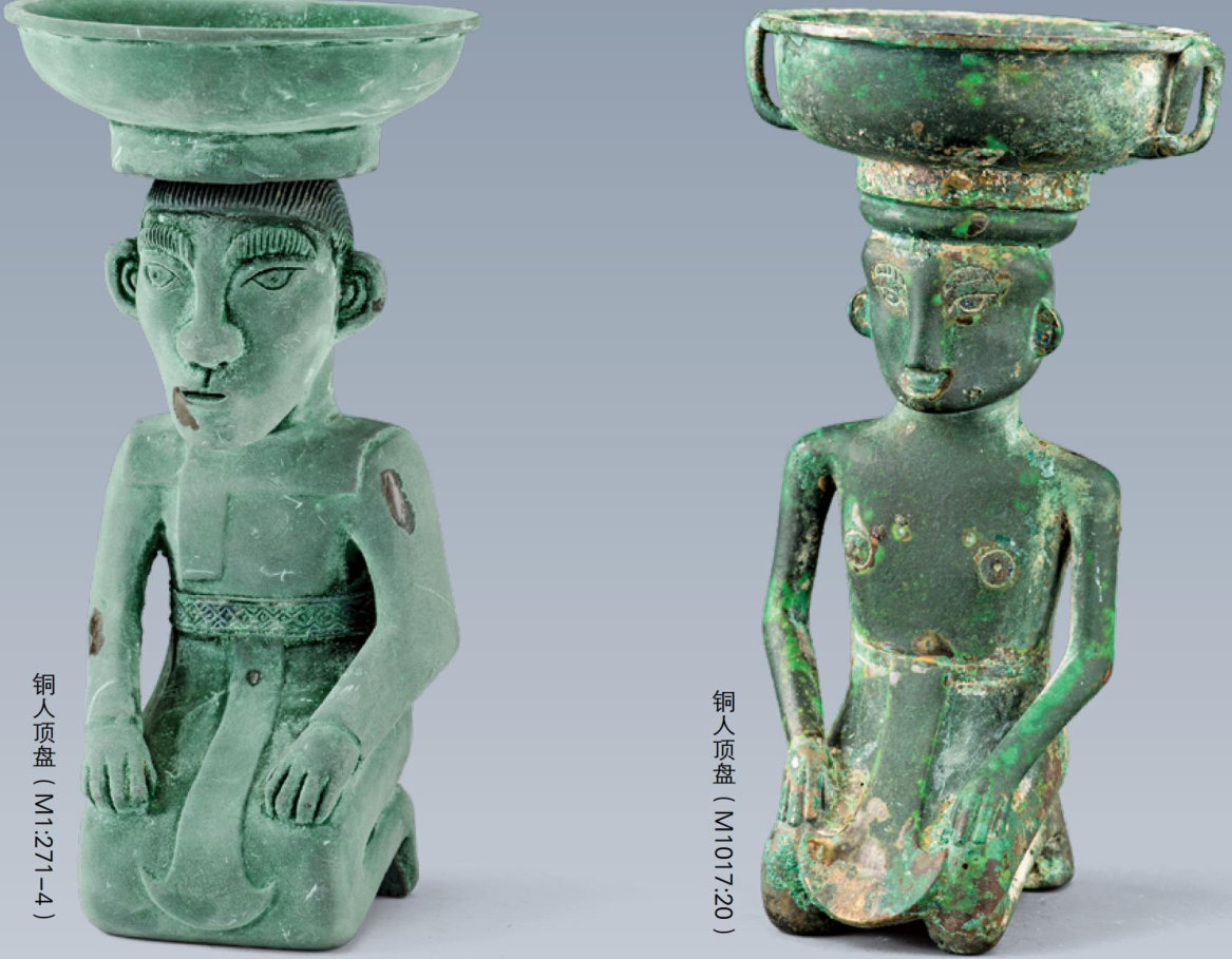 西翼城大河口西周墓地M1、M1017L 分别出土有一件铜人顶盘。M1出土的铜人顶盘(M1:271-4)通高15.2厘米,位于铜卤(M1:271-1)内。铜人为瓜子脸,眉骨突出,眼睛正视前方,高鼻梁,嘴微张,头发后梳,后脑留有发髻。铜人身着立领衣,有矩形垫肩,右衽,腰束宽带,下身着垂斧形蔽膝。头顶圆盘,盘口微敞,窄折沿,小方唇,弧腹缓收,圜底近平,高直圈足,足底较平,人头顶在盘外底面。(剩余3505字)
