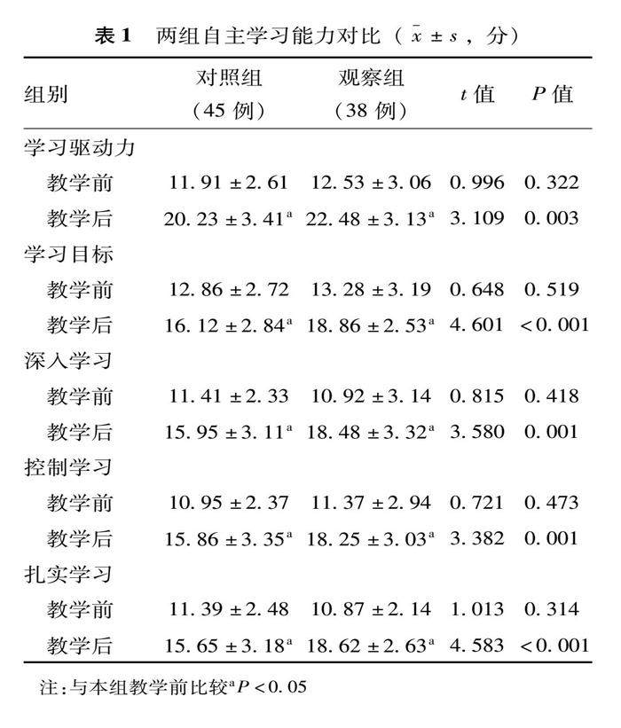 [摘 要] 目的 探讨以问题为导向的教学方法( PBL) 与以案例为基础的教学方法( CBL) 结合用于老年综合评估教学对学生学习效果的影响。方法 选取2017年1月~2020年12月在空军军医大学西京医院接受老年综合评估教学的本科生83名,以2017年1月~2018年12月接受 CBL 教学的本科生45 名为对照组,以2019年1月~2020年12月接受 PBL 与 CBL 教学法相结合教学的本科生38名为观察组,对比两组学生的自主学习能力、学习效果、综合能力及对教学方法的认同情况。(剩余8951字)