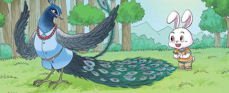 孔 雀阿蓝拥 有 靓丽的尾羽,每 当 听到大家的夸赞,他总是十分骄傲。