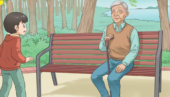 洋 洋来到湖边,看粼粼的波光,看树 梢 上 蹦 跳的小 鸟,看“涂”了新绿的草木……还看到了树下的一位爷爷。