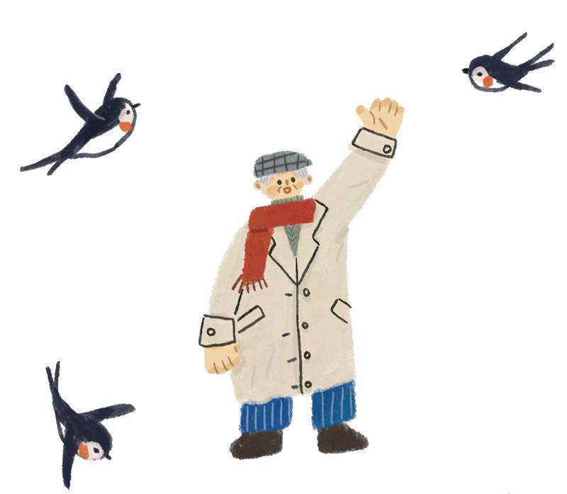 那时候我姥爷还在。不过,他不总住我们家,只有到春天,孩子们念叨着“七九河开,八九雁来”的当儿,他才会穿着那件米色的风衣,戴着那顶灰色的、起了毛边的鸭舌帽,风尘仆仆地走到钟鼓楼下。而随着钟鼓楼顶上一片喳喳的鸟儿叫声响起,我、大水子、小那子便得了通报——姥爷来了!几个人呼啦而上,跑过去迎接。