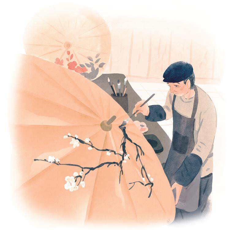 茶香混着淡淡的桐油味,在不大的店里悠悠散开。靠窗的藤椅上,一位老伯正专注地摆弄着竹条,身旁堆着削得笔直的伞骨、裁好的皮纸,还有盛着颜料的青瓷小碗。(剩余942字)