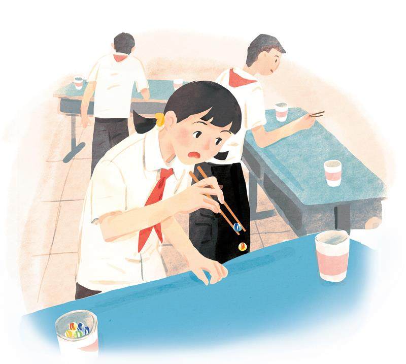 “稳住!我们能赢……”一场紧张而刺激的夹玻璃弹珠比赛在我们班拉开了序幕。我们三人一组,每人用筷子从桌子左边的纸杯中夹起玻璃弹珠,放到桌子右边的纸杯中。每人每轮限时两分钟,一共进行三轮比赛:第一轮为右手夹弹珠,第二轮为左手夹弹珠,第三轮没有限制。最终,哪个组夹的玻璃弹珠最多就算赢。