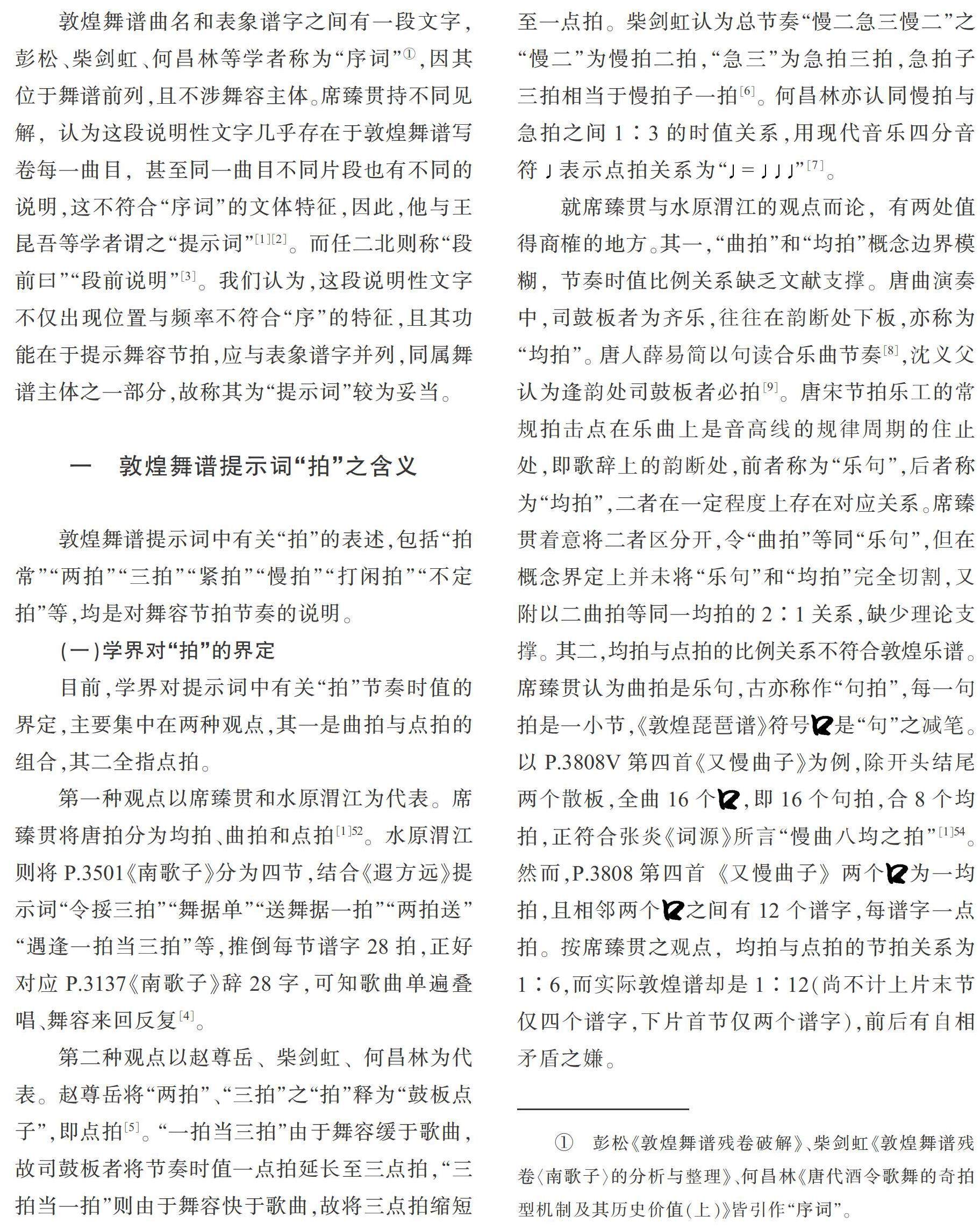 内容摘要:敦煌舞谱的提示词主要用于规范节拍类型,古舞谱“拍”作为音乐单位,相当于现代音乐的小节。敦煌舞谱节拍类型可分为常规型和特殊型,“拍常”“慢二急三”“慢四急七”属常规节拍型。敦煌谱舞容一字的时值,“拍常”于紧曲中占二拍,慢曲中占四拍;“慢拍”于紧曲中占四拍,慢曲中占八拍;“急拍”皆占一拍。“令至据单”“掯”属特殊节拍型,是常规节拍的特殊变换。(剩余13442字)