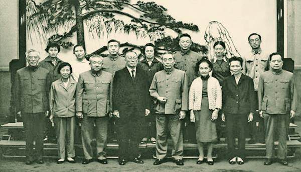 周恩来接见顾毓琇教授夫妇及女儿时合影。周培源(前排左一)、廖承志(前排左三)、罗青长(前排右一)、李冠华(后排左二)等陪同接见