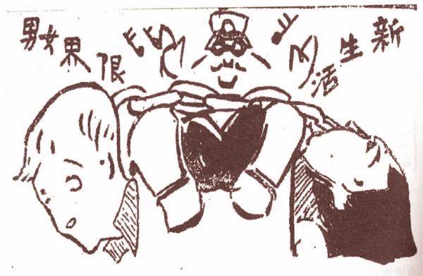 原载1934年9月26日《红色中华》第238期第4版。该版刊发《国民党提倡奴隶道德》的报道。报道指出:“新生活运动以来,除所谓禁止男女同行布告外,尚有所谓禁止男女同住同食之命令,而广东政治研究会更通过男女界限如下:(一)禁止男女同车,(二)禁止男女同食,(无论官署,家庭,茶楼,酒馆,一律禁止男女同食,女人须俟男人食终,方可进食),(三)禁止男女同住(旅馆一律禁止男女同住一室),(四)禁止军人人民同行,(五)电影馆禁止开映男女同演影片。(剩余92字)
