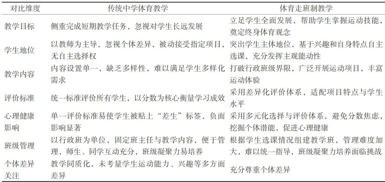 Department of Physical Education, Zhengzhou Health Colege, Zhengzhou,Henan Province, 45Oooo China [Abstract] In order to deepen the integration of sports and education,this research promotes the application of shift based teaching in secondary school physical education teaching,and asists in the reform ofsecondary school physical educationteaching,this article interprets theconnotationof sportsand education integration,comparing thedifferences between sports shift based teaching and traditional physical education teaching models,andanalyzing the importance of mplementing shift based teaching in secondary school sports.Research suggests that the sports classbased teaching systemis basedon interest,empowers students with the power tochoosecourses,highlights the student'ssubject status, and plays an important role in adapting to students' personality development, improving student personality shaping, and shaping secondary shool sports culture. The implementation path of the secondary school sports classbased teaching system is proposed,which includes transforming sports cognition,innovating teaching methods,standardizing clas management, optimizing resource allocation,and strengthening teacher construction.