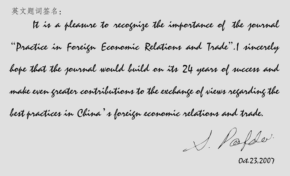 欣悉《对外经贸实务》杂志是一份很重要的杂志。我衷心地祝愿《对外经贸实务》杂志在其24年成功的历程上,为中国的对外经贸出色实践做出更大的贡献。(剩余33字)