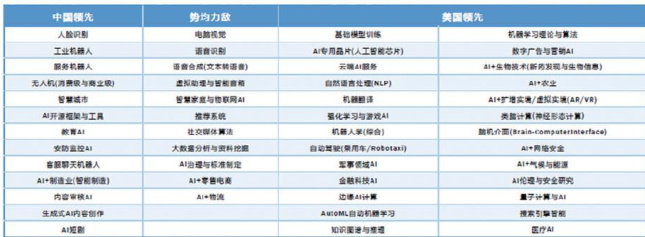 1.中美AI博弈态势:中国领先领域(13个):人脸识别、工业机器人、服务机器人、无人机、智慧城市等;美国领先领域(26个):机器学习理论与算法、数字广告与营销AI、AI+生物技术等;势均力敌领域(11个):电脑视觉、语音识别、自然语言处理等。