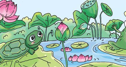 有了蟾蜍的陪伴,小青蛙觉得日子过得很充实。他们有时在一起唱歌,有时在一起游泳,更多的是一起照看荷塘。眼看着小荷快露出尖尖角了,青蛙看出蟾蜍有些闷闷不乐,问道:“蟾蜍,你怎么了,哪儿不舒服?要不要请兔子医生看看?”