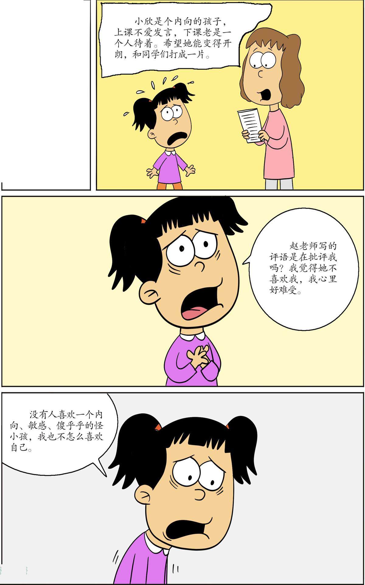 小欣是个内向的孩子,上课不爱发言,下课老是一个人待着。(剩余18字)