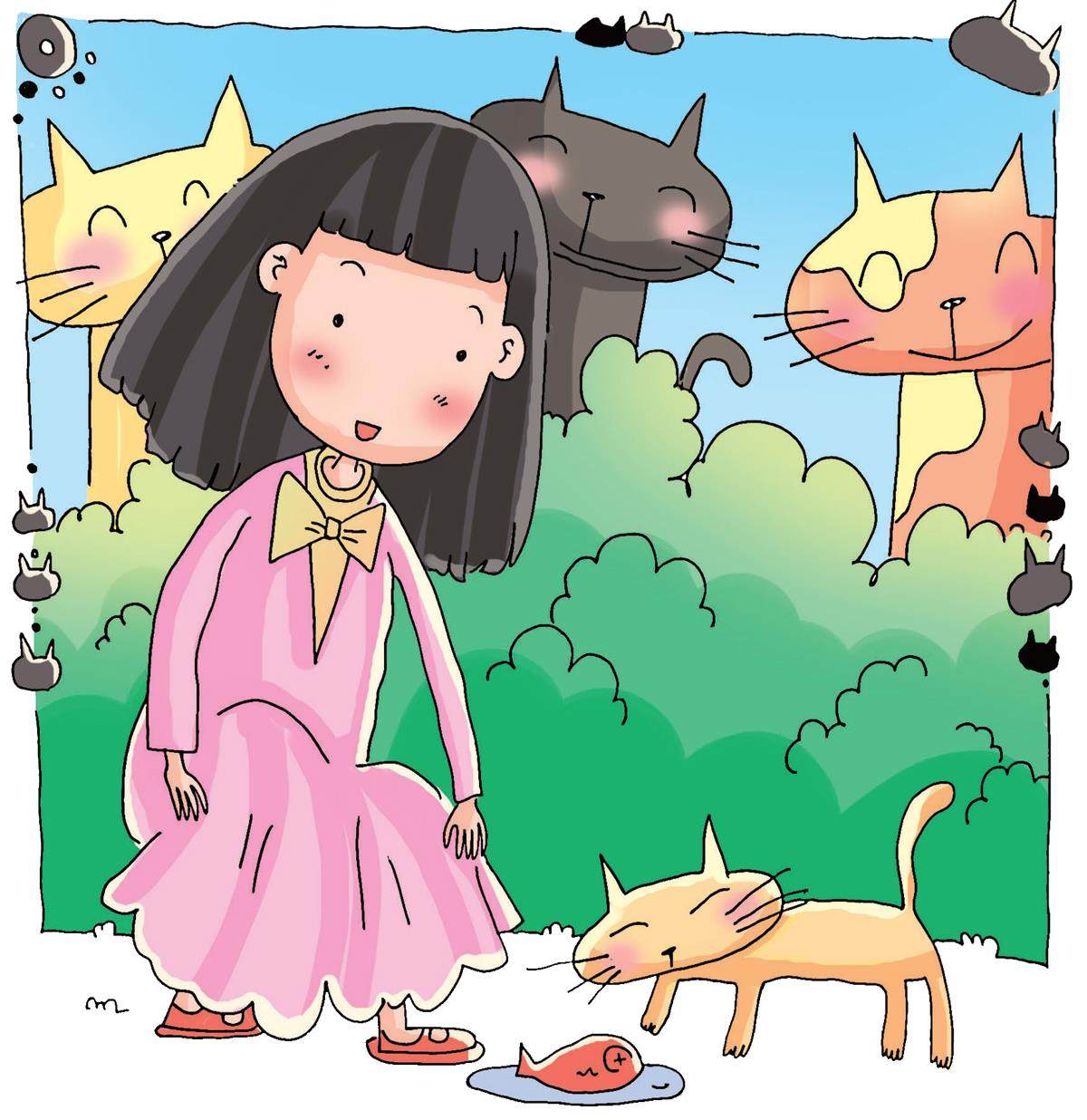 楠楠居住的楼下不知道什么时候来了一群野猫,时常在安有水管的灌木丛中活动。每天放学后,楠楠总要先逗一番小猫才回家。