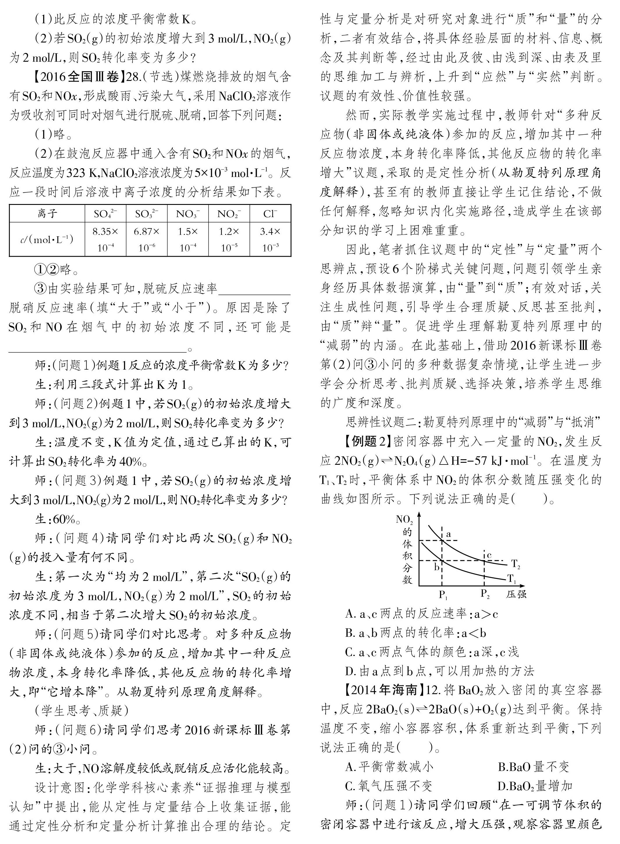 【摘要】本文以选修4第二章第三节《化学平衡》教学为例,论述构建思辨型课堂教学模式的途径,提出以有效思辨议题为载体,选取思辨源,寻找思辨点,以阶梯性的关键问题为靶向,聚焦核心目标(思辨性思维),以达成度评价为手段评价思辨能力的发展。