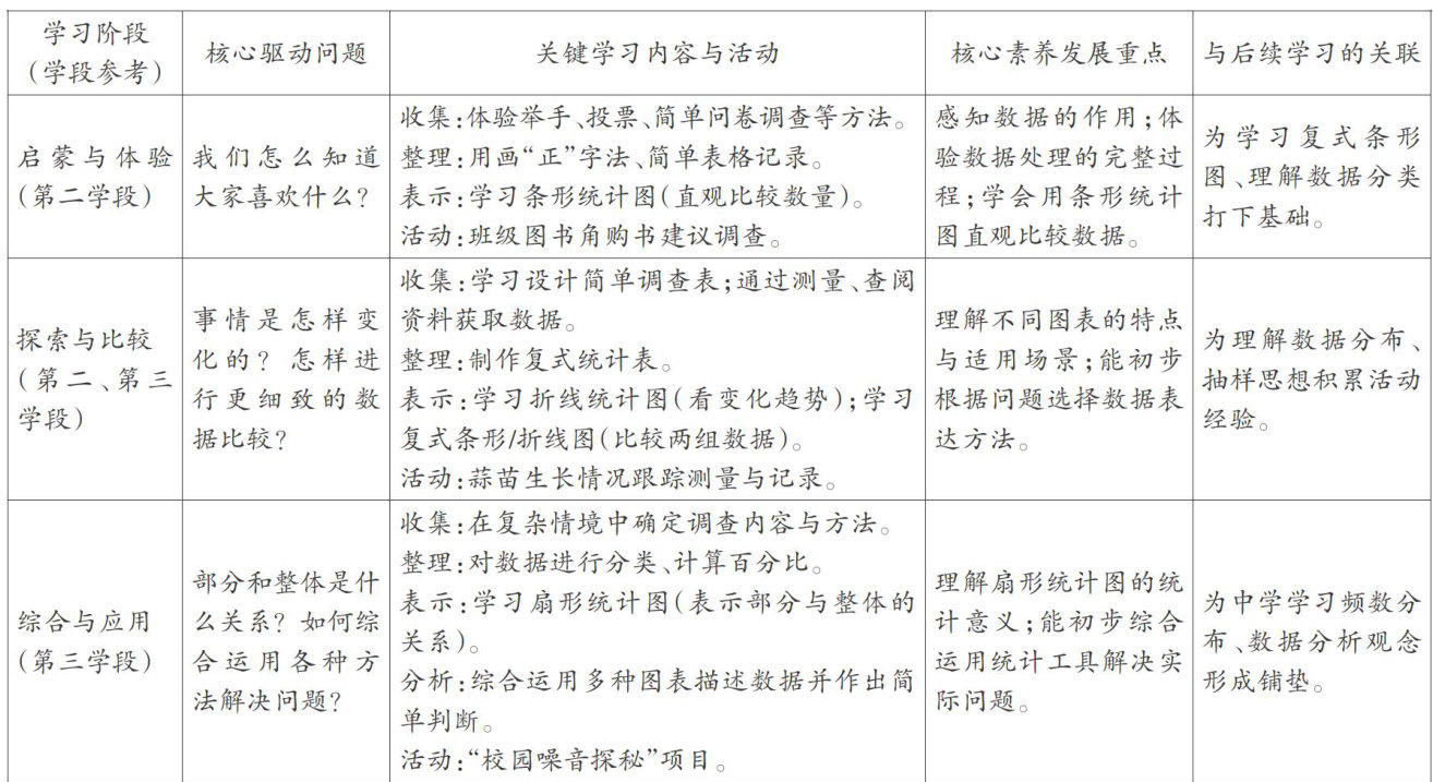义务教育数学课程标准强调以真实情境培育学生数据意识,大单元教学成为落实这一要求的重要途径。本期三篇文章聚焦“数据的收集、整理与表达”主题内容整合,从不同维度呈现大单元教学设计与实践探索:其一,构建分层递进的素养目标培育教学体系;其二,依托校园真实情境设计连贯的实践活动;其三,整合单式与复式条形统计图的教学以实现思维进阶。(剩余3587字)