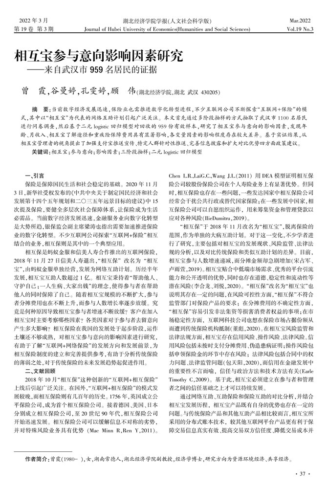 摘 要:当前数字经济发展迅速,保险业也需推进数字化转型进程,不少互联网公司不断探索“互联网+保险”的模式,其中以“相互宝”为代表的网络互助计划引起广泛关注。本文首先通过多阶段抽样的方式抽取了武汉市1100名居民进行问卷调查,然后基于二元logistic回归模型对回收的959份有效样本,研究了相互宝参与意向的影响因素,发现年龄、月收入、相互宝了解途径和重疾险保障费用具有显著影响,各变量因素的影响程度存在较大差异。(剩余7573字)