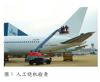 民航飞机做完定检维修,在飞机离场前,维修人员需要环绕飞机一圈,对飞机的外部做一次完整的检查,确保飞机的状态适合飞行。由于飞机高度的原因,检查飞机的上表面区域,包括机身顶部、机翼和水平尾翼上表面、垂直尾翼等区域,维修人员驾驶升降平台车环绕飞机一圈进行目视检查是普遍做法,如图1所示。