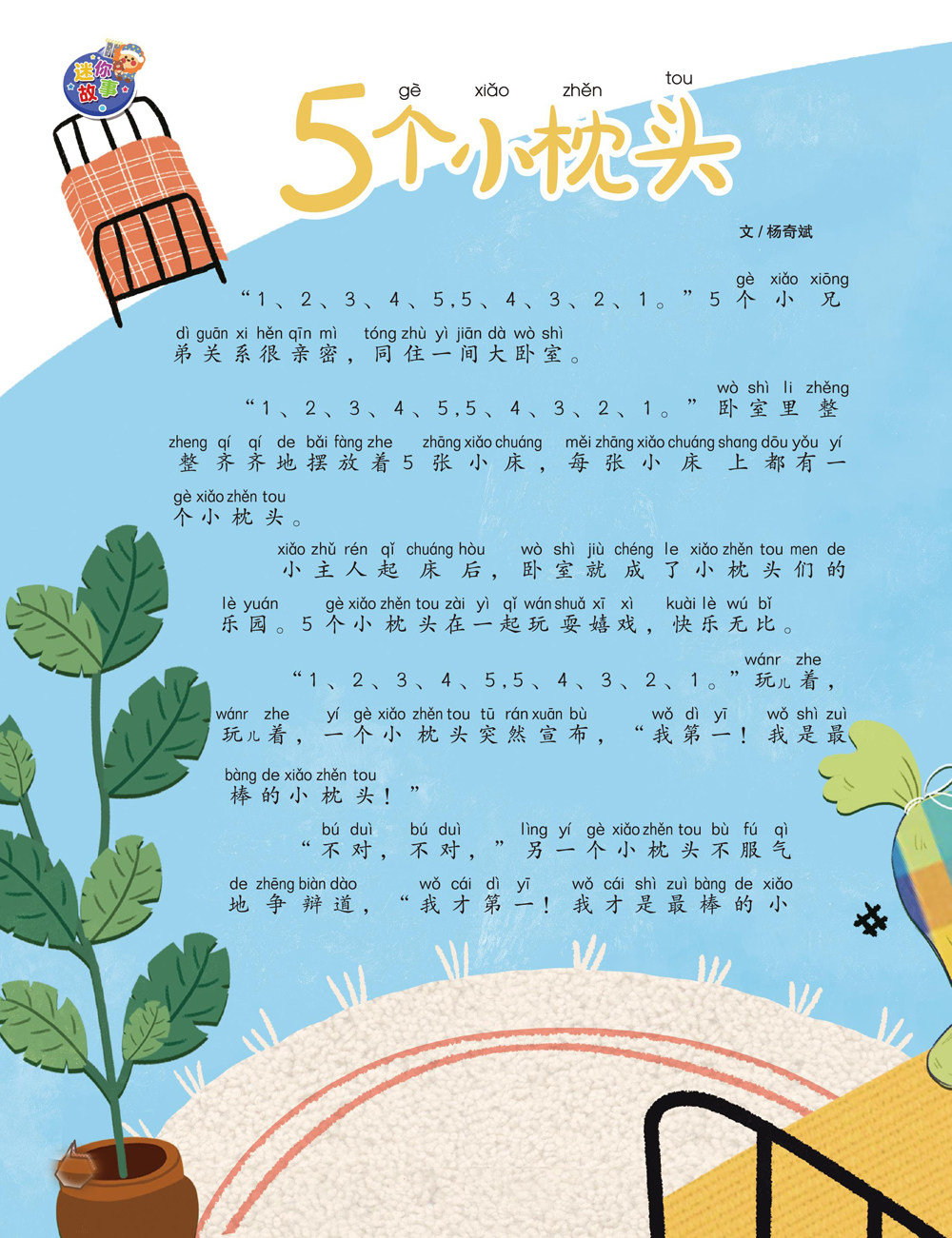 “1、2、3、4、5,5、4、3、2、1。”卧室里整整齐齐地摆放着5 张小床,每张小床上都有一个小 枕 头。