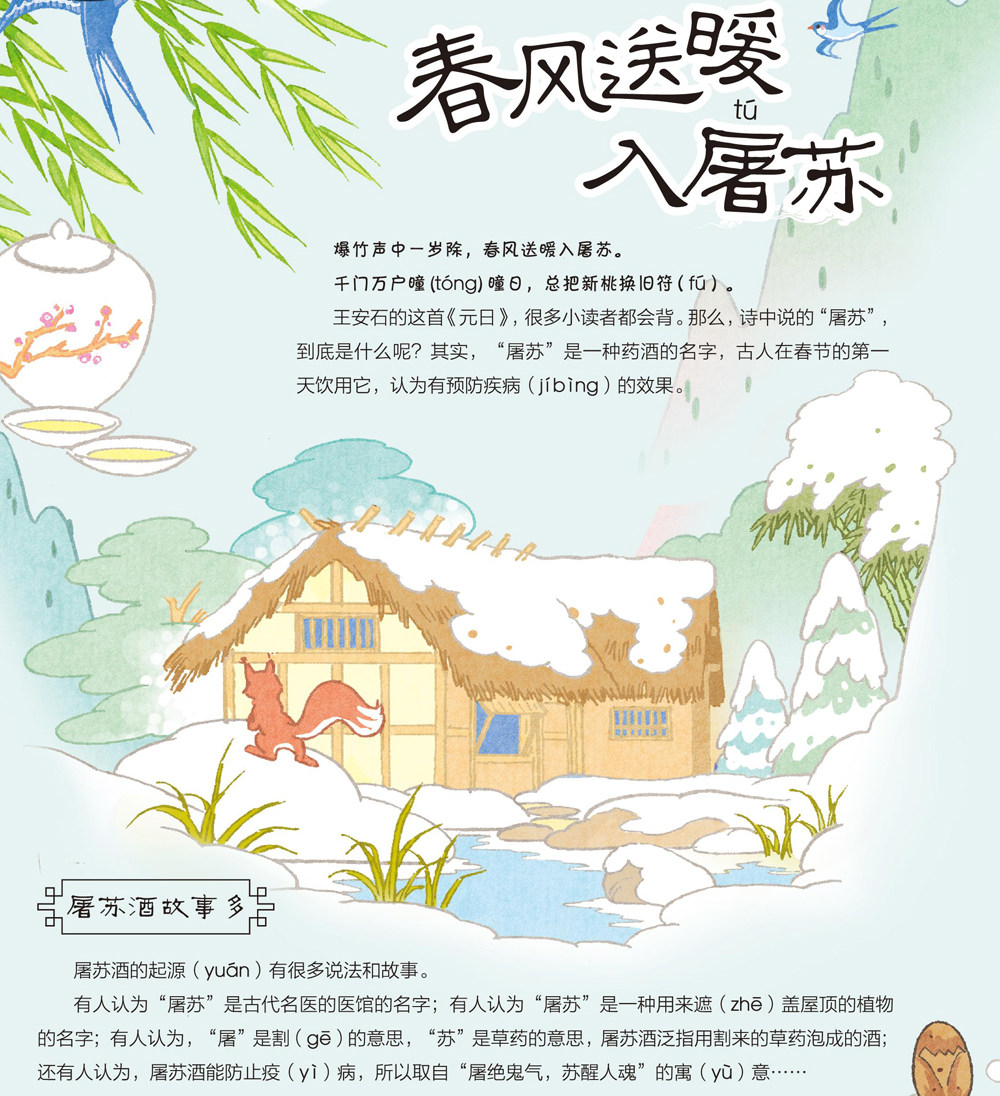王安石的这首《元日》,很多小读者都会背。那么,诗中说的“屠苏”,到底是什么呢?其实,“屠苏”是一种药酒的名字,古人在春节的第一天饮用它,认为有预防疾病(jIbKng)的效果。