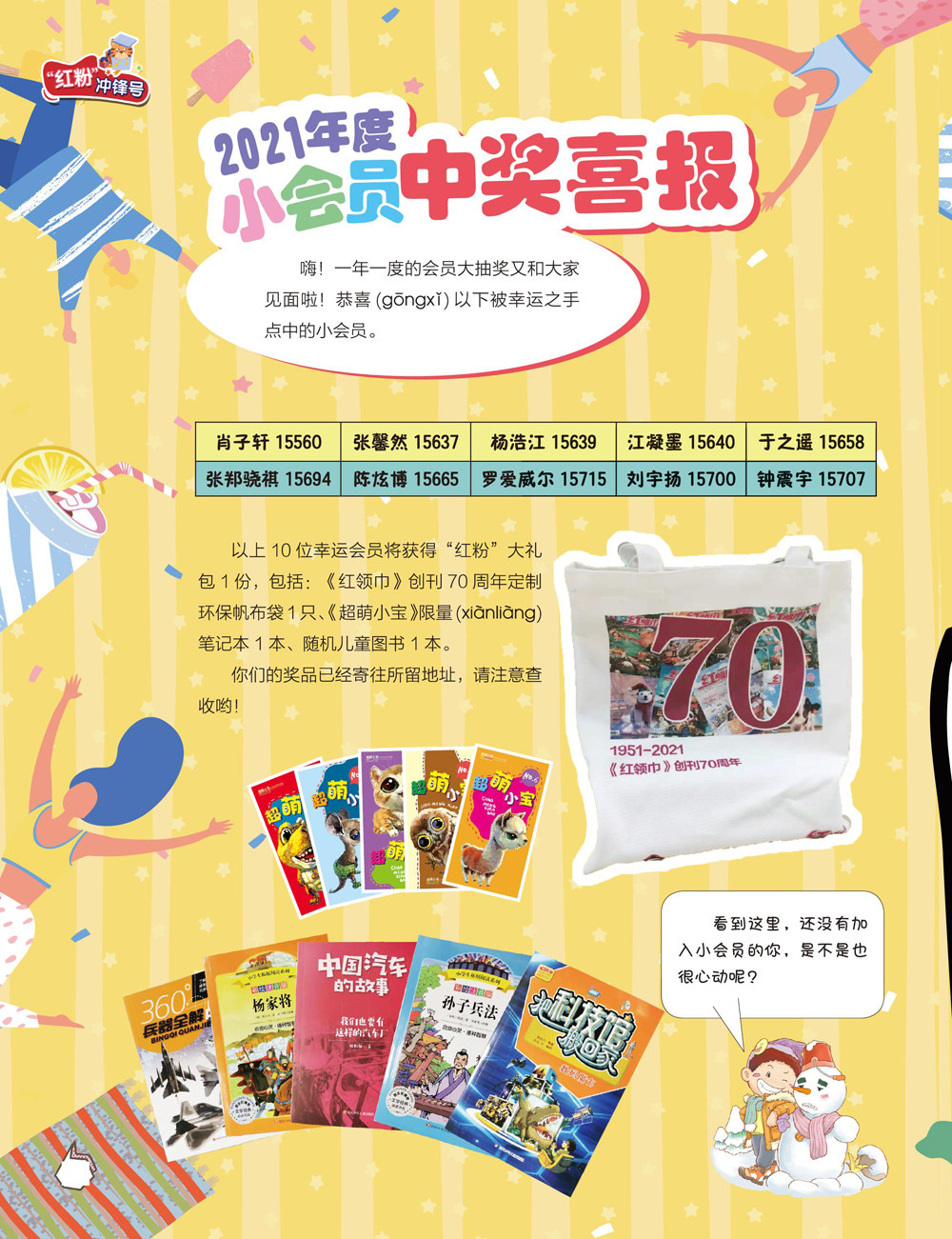 以上10位幸运会员将获得“红粉”大礼包1份,包括:《红领巾》创刊70周年定制环保帆布袋1只、《超萌小宝》限量(xiSnliSng)笔记本1本、随机儿童图书1本。