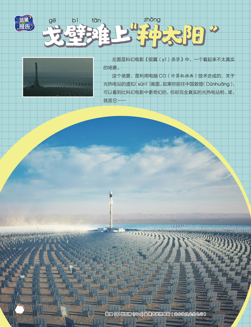 这个场景,是利用电脑CG(计算机动画)技术合成的、关于光热电站的虚拟(xOnJ)画面。如果你前往中国敦煌(DOnhuWng),可以看到比科幻电影中更奇幻的,但却完全真实的光热电站哟。喏,就是它——