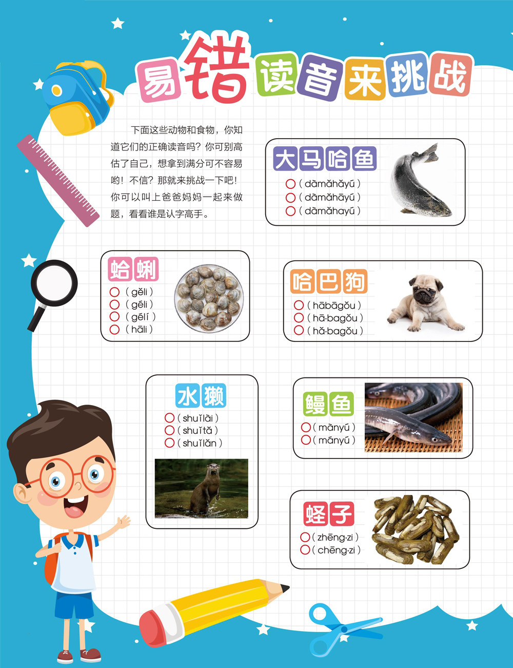 下面这些动物和食物,你知道它们的正确读音吗?你可别高估了自己,想拿到满分可不容易哟!不信?那就来挑战一下吧!你可以叫上爸爸妈妈一起来做题,看看谁是认字高手。(剩余0字)