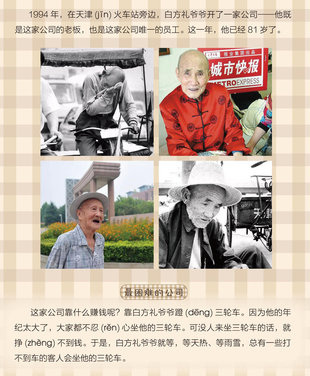 这家公司靠什么赚钱呢?靠白方礼爷爷蹬(dEng)三轮车。因为他的年纪太大了,大家都不忍(rDn)心坐他的三轮车。可没人来坐三轮车的话,就挣(zhFng)不到钱。(剩余556字)