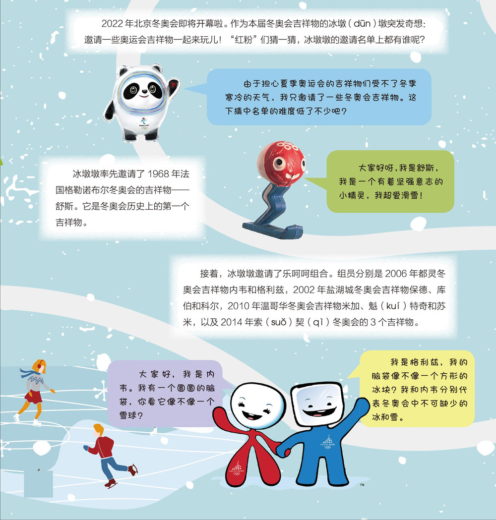 2022年北京冬奥会即将开幕啦。作为本届冬奥会吉祥物的冰墩(dOn)墩突发奇想:邀请一些奥运会吉祥物一起来玩儿!“红粉”们猜一猜,冰墩墩的邀请名单上都有谁呢?