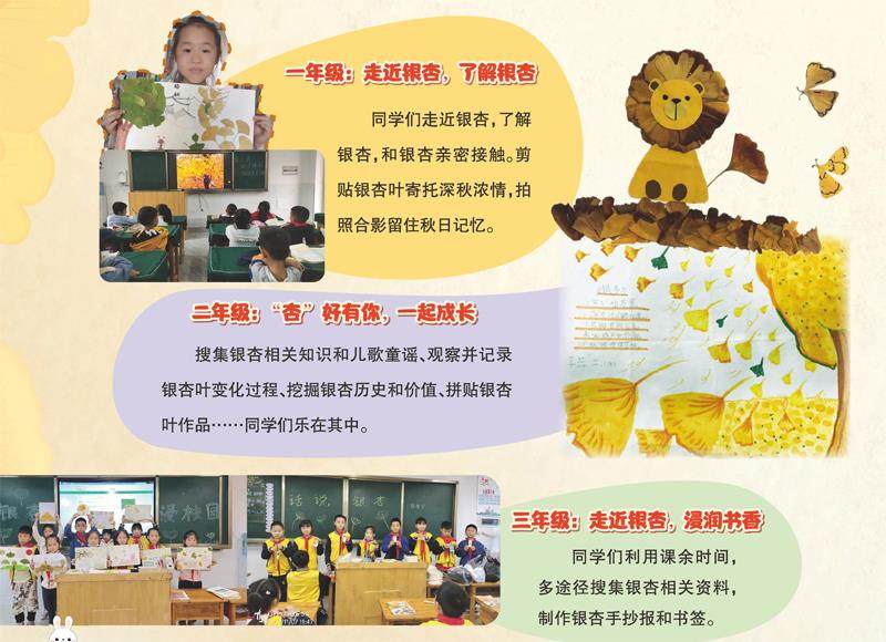 霜打银杏叶金黄,满地落叶铺金床。为提升学生综合实践能力,落实五育并举方针,学校充分利用银杏大道这一得天独厚的资源,将语文、科学、美术等课程有效整合,开展“小银杏·大课程”的综合实践课程,在活动中进一步提升学生的综合素养。