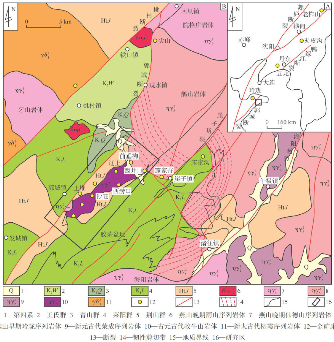 胶莱盆地东北缘作为胶东地区三大金成矿带之一牟平一乳山成矿带的组成部分,先后探明了辽上、西涝口特大型金矿床和土堆一沙旺、西井口、前垂柳、蓬家乔、宋家沟等中型一大型金矿床,还分布有多个金矿点。特别是在辽上、西涝口金矿区,受胶西北深部探矿取得突破性进展的启发,借鉴其找矿经验,在深部( -500m 以下)发现了特大型金矿,是胶东地区东部自前仅发现的2处金金属量超过50t的特大型金矿,并且其矿化类型以黄铁矿碳酸盐脉型为主,属于胶东地区一种新类型金矿—“辽上式"金矿,区别于蚀变岩型(焦家式金矿)和石英脉型(玲珑式金矿),因此受到越来越多的关注。(剩余11773字)