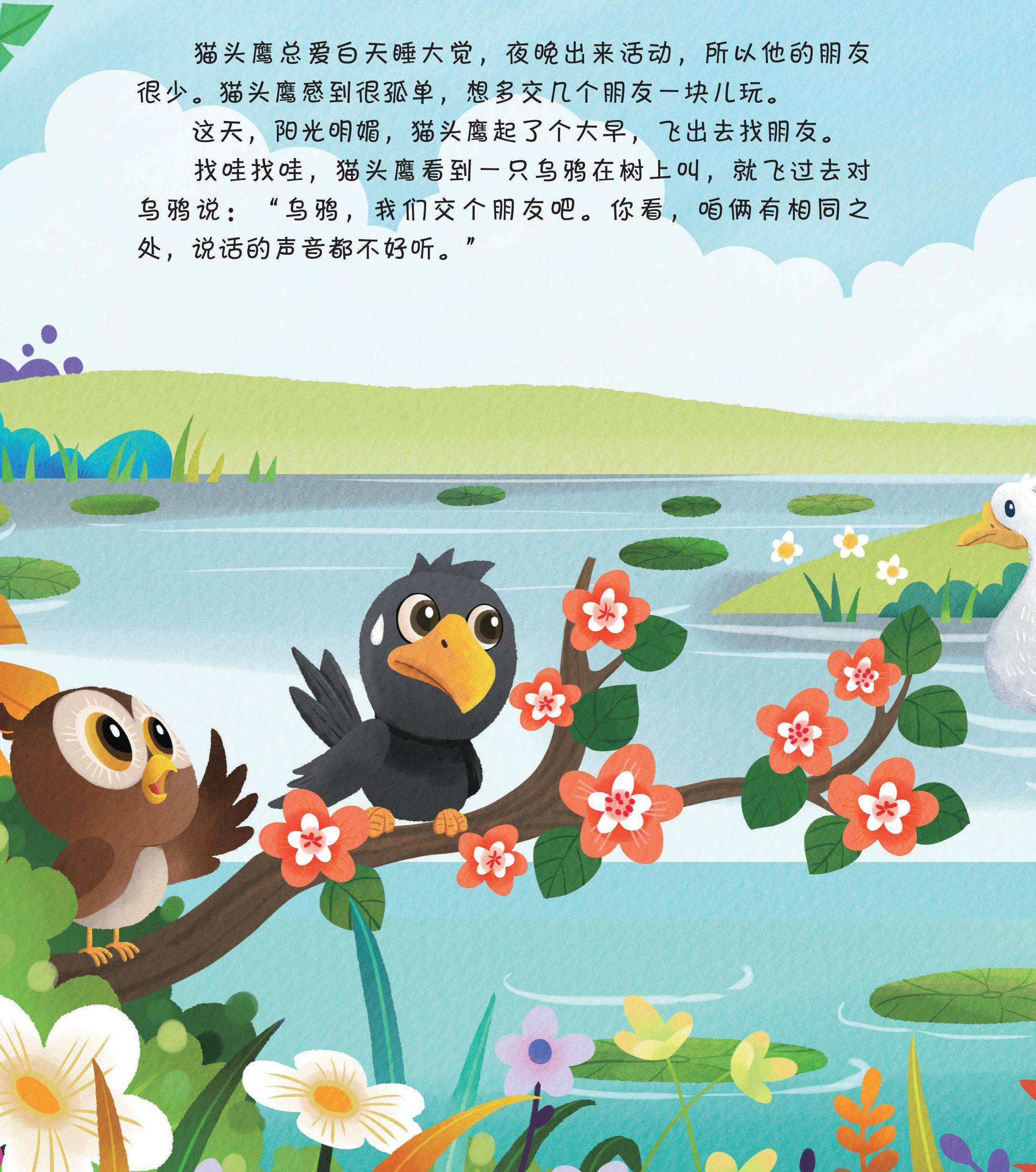 找哇找哇,猫头鹰看到一只乌鸦在树上叫,就飞过去对乌鸦说:“乌鸦,我们交个朋友吧。你看,咱俩有相同之处,说话的声音都不好听。”