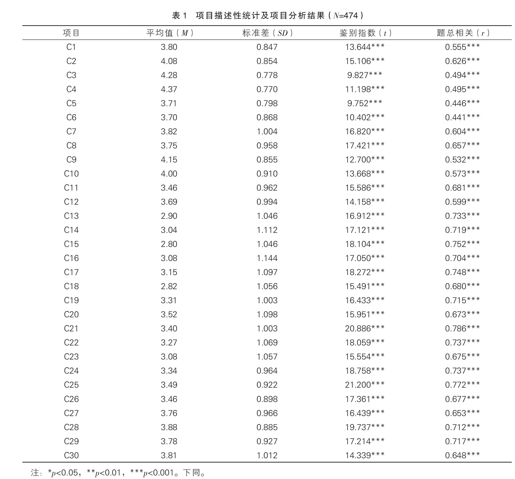 摘要:为了给高中生生涯发展测量提供工具,经过两次测量与分析,编制了高中生生涯发展量表。方法:在访谈的基础上编制高中生生涯发展初测量表题目。之后,对474名高中生进行第一次施测,做项目分析和探索性因子分析。另外选取517名高中生进行第二次施测,做验证性因子分析以及内部一致性信度、分半信度、内容效度、结构效度和效标关联效度检验。(剩余6687字)