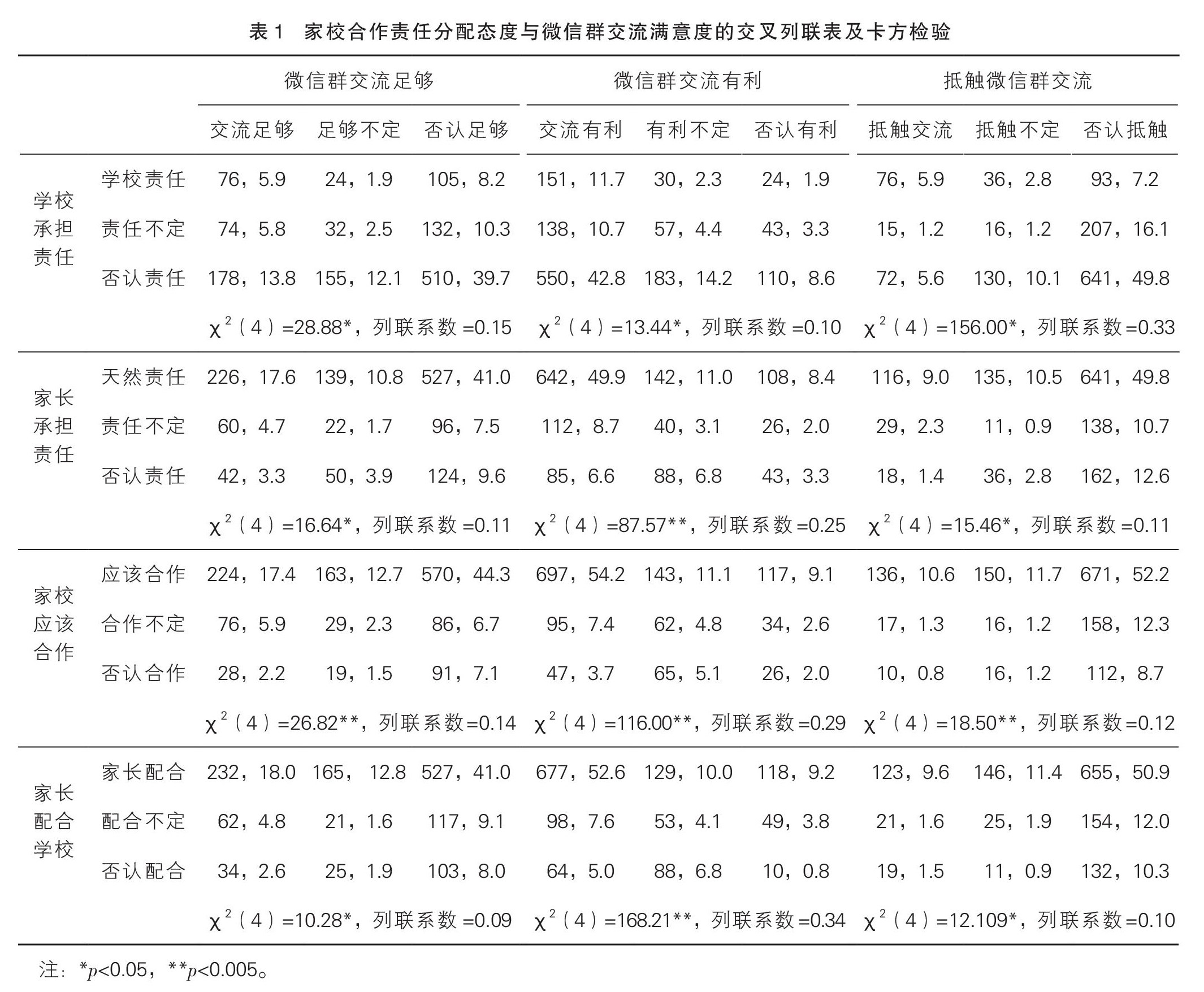 小学生家长家校合作责任分配态度 与班级微信群交流满意度的关联分析
