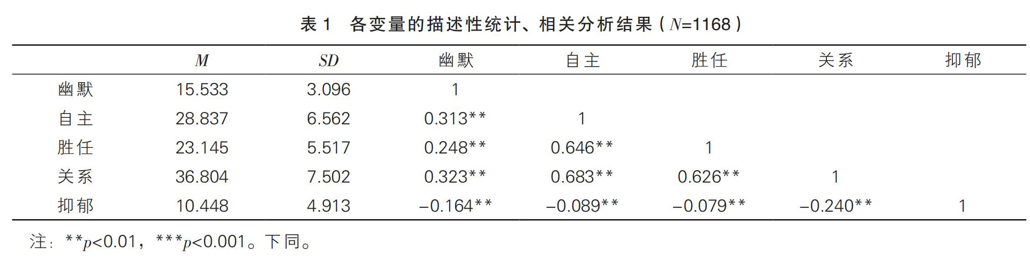 摘要:为了研究幽默对中职学生抑郁症状的影响,并检验基本心理需要(关系需要、自主需要、胜任需要)的中介作用,以1168名中职学生为研究对象,通过问卷法考察了幽默、基本心理需要、抑郁症状的关系。结果表明,中职学生幽默与抑郁症状呈显著负相关,与基本心理需要呈显著正相关;基本心理需要与抑郁症状呈显著负相关;幽默显著负向预测中职学生的抑郁症状,关系需要在幽默与抑郁症状之间起中介作用,胜任需要和自主需要的中介作用不显著。(剩余7052字)