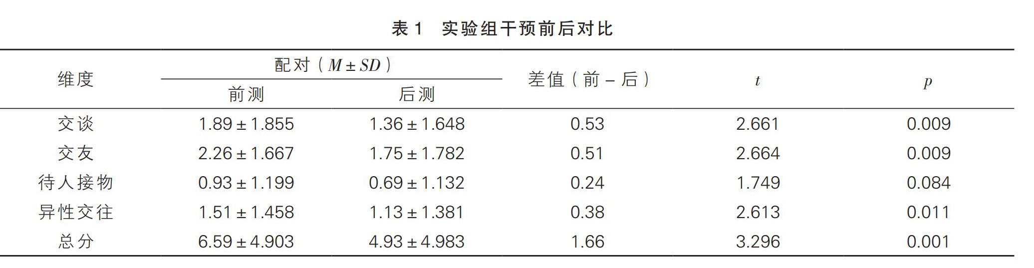 摘要:为探索如何提高中学生的人际交往能力,选取广东省佛山市2所乡镇公办中学的160名学生,采用“人际关系综合诊断量表”和“社交回避及苦恼量表” 进行问卷调查,并对实验组进行团体辅导干预。通过实验组前后测的对比研究及与没有参加团体辅导的班级对照发现,实验组的学生在经过8次团体辅导后,交谈、交友、异性交往和待人接物这四个因子得分均比辅导前有所降低,均呈现出统计学意义;对照组学生则没有显著变化;实验组和对照组在社交苦恼、社交回避两个因子上均不存在显著差异。(剩余9747字)