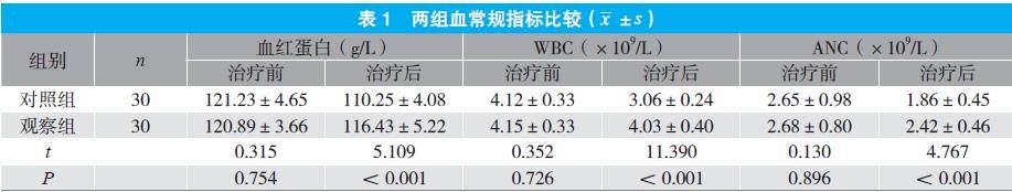 摘要:目的 探讨生血宝合剂与鲨肝醇片预防早期乳腺癌术后紫杉醇脂质体周疗期间骨髓抑制的临床疗效。方法 选取2024年6月至2025年3月医院收治的60例早期乳腺癌术后采取紫杉醇脂质体周疗的患者为研究对象,按随机数表法分为对照组与观察组各30例。对照组采用常规对症支持治疗,观察组在对照组基础上采用生血宝合剂与鲨肝醇片治疗,比较血常规指标[血红蛋白、白细胞(WBC)、中性粒细胞(ANC)]水平、骨髓抑制发生率、WBC与ANC恢复时间及不良反应发生情况。(剩余4076字)