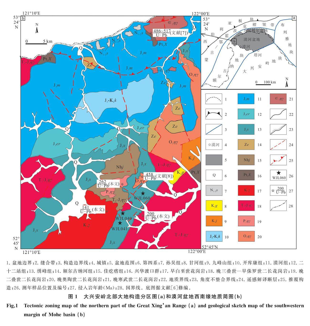 漠河盆地位于大兴安岭北部,绣峰组作为漠河盆地最下部层位,其形成时代、物源区特征及大地构造背景等对研究漠河盆地的形成与演化具有重要意义。本文对漠河盆地西南缘绣峰组砂岩进行了碎屑锆石LA-ICP-MS U-Pb年代学和地球化学分析。锆石年代学研究表明,147组碎屑锆石年龄分布于778~181 Ma之间,显示出一个主峰约为198 Ma,分为778、528~393、252、223~181 Ma等4个年龄组,分别与新元古代Rodinia超大陆裂解事件、额尔古纳地块与兴安地块碰撞拼合岩浆活动事件、古亚洲洋俯冲闭合岩浆活动事件和蒙古—鄂霍茨克俯冲闭合岩浆活动事件相对应。(剩余37248字)