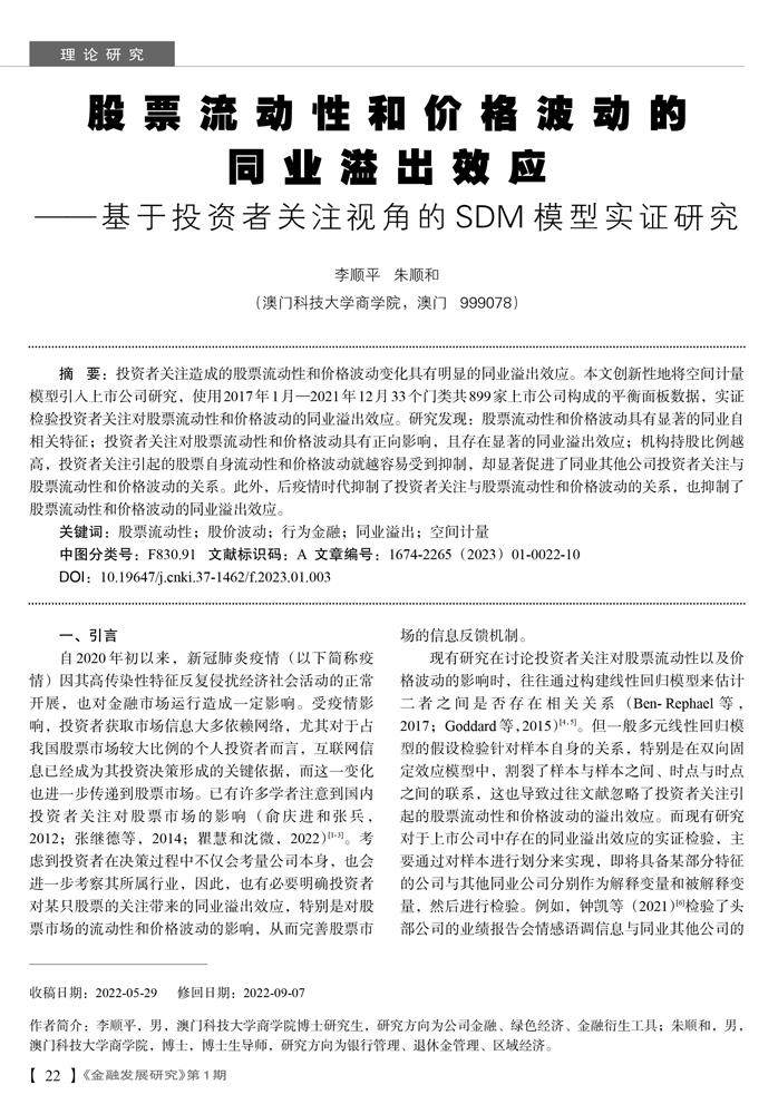 摘 要:投资者关注造成的股票流动性和价格波动变化具有明显的同业溢出效应。本文创新性地将空间计量模型引入上市公司研究,使用2017年1月—2021年12月33个门类共899家上市公司构成的平衡面板数据,实证检验投资者关注对股票流动性和价格波动的同业溢出效应。研究发现:股票流动性和价格波动具有显著的同业自相关特征;投资者关注对股票流动性和价格波动具有正向影响,且存在显著的同业溢出效应;机构持股比例越高,投资者关注引起的股票自身流动性和价格波动就越容易受到抑制,却显著促进了同业其他公司投资者关注与股票流动性和价格波动的关系。(剩余14132字)