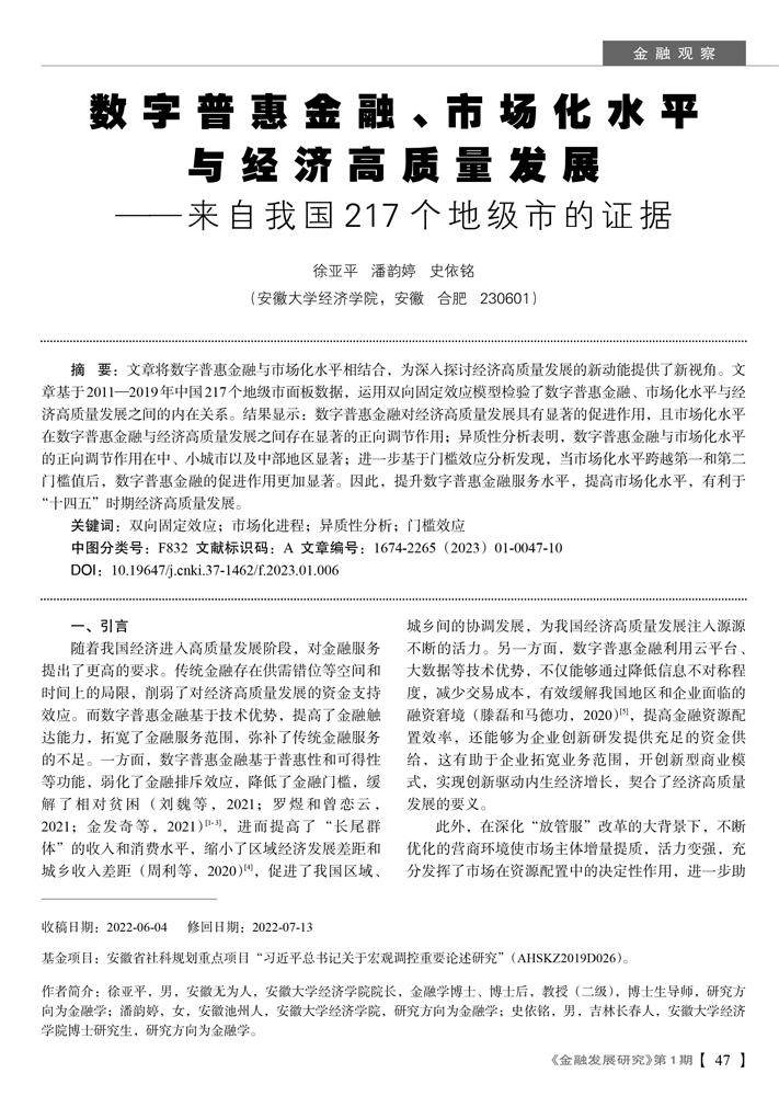 摘 要:文章将数字普惠金融与市场化水平相结合,为深入探讨经济高质量发展的新动能提供了新视角。文章基于2011—2019年中国217个地级市面板数据,运用双向固定效应模型检验了数字普惠金融、市场化水平与经济高质量发展之间的内在关系。结果显示:数字普惠金融对经济高质量发展具有显著的促进作用,且市场化水平在数字普惠金融与经济高质量发展之间存在显著的正向调节作用;异质性分析表明,数字普惠金融与市场化水平的正向调节作用在中、小城市以及中部地区显著;进一步基于门槛效应分析发现,当市场化水平跨越第一和第二门槛值后,数字普惠金融的促进作用更加显著。(剩余13878字)