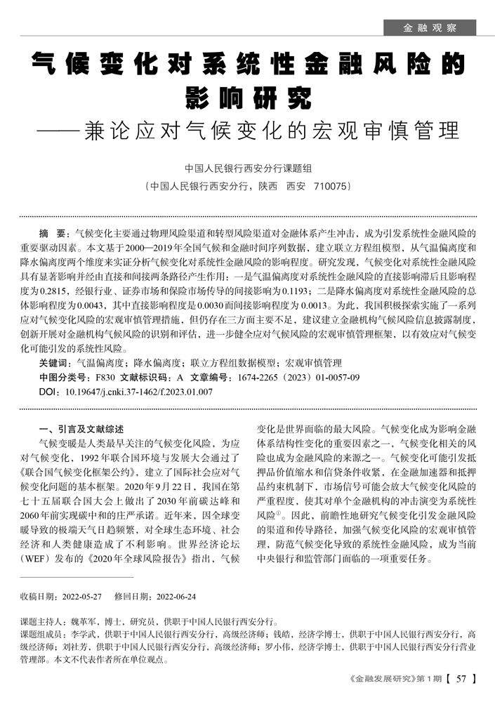摘 要:气候变化主要通过物理风险渠道和转型风险渠道对金融体系产生冲击,成为引发系统性金融风险的重要驱动因素。本文基于2000—2019年全国气候和金融时间序列数据,建立联立方程组模型,从气温偏离度和降水偏离度两个维度来实证分析气候变化对系统性金融风险的影响程度。研究发现,气候变化对系统性金融风险具有显著影响并经由直接和间接两条路径产生作用:一是气温偏离度对系统性金融风险的直接影响滞后且影响程度为0.2815,经银行业、证券市场和保险市场传导的间接影响为0.1193;二是降水偏离度对系统性金融风险的总体影响程度为0.0043,其中直接影响程度是0.0030而间接影响程度为 0.0013。(剩余14466字)