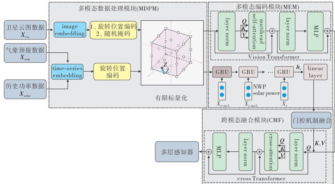 Abstract:Toaddress thelimitationsof multi-modal fusioninphotovoltaicpowerprediction,specificallythechalenges posed bymodalityheterogeneityindatarepresenationandinsuffcientcross-modalcorelationodeling,tispaperproposdamultimodal meteorologicaldatafusionmodel(MMDF).The modelfirstlyappiedfinite scalarquantization(FSQ)toachieveunifiedrepresentationofheterogeneousdatasources,effectivelyovercomingthebotleneckofcross-modalinformationalignment andreducing computational complexityduring fusion.Then,itdesigneda hybrid encoding featureextraction module byintegratingtheglobalspatial modelingcapabityof the VisionTransformerwiththetemporaldynamicscaptureof theGRU-Linear architecture,whichsignificantlyenhancedthediscriminabilityofmulti-modal features.Furthermore,itconstructedastaged cros-modal fusion strategybasedonagateddynamicfusion mechanism,and employed CrossTransformer todeeply integrate time-seriesandcloud image features,therebycapturingcomplex inter-modalrelationships.Experimentalresultsshowthat, compared with the FusionSF algorithm,MMDF model improves MAE,RMSE,and R2 by 5.69% ,12. 44% ,and 4. 52% ,respectively,onaulti-modalsolarpowerdataset,providing bothatheoreticalbreakthroughandanewparadigmforengineering applications in photovoltaic power prediction under complex weather conditions.