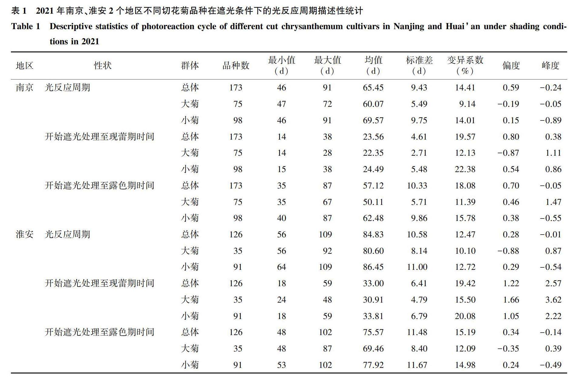 摘要: 本研究以229份切花菊品种为试验材料,分别种植于南京、淮安2地,其中南京、淮安2地相同品种70个,在栽培过程中进行光周期调控处理,统计各品种从短日照处理开始至现蕾期、露色期所需天数及光反应周期。发现在品种资源群体中,光反应周期存在丰富的变异,南京种植各品种光反应周期的总体变异系数为14.41%,淮安种植各品种光反应周期的总体变异系数为12.47%。(剩余7576字)
